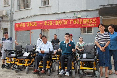 为切实提高残疾人生活质量,增强残疾人社会参与能力,10月10日上午,南宁市江南区残联在残联办公大院里举行了2016年度“集善工程—(爱之翼)助残行动”电动轮椅发放工作,江南区辖区13位二级以上肢体残疾人免费获赠使用。