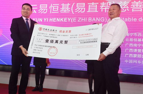 2017年1月7日下午,“聚爱善缘 · 一直帮助您”——云易恒基·易直帮慈善捐赠仪式在南宁市举行。云易恒基科技(深圳)有限公司向广西残疾人福利基金会捐赠人民币壹佰万元,全部用于南宁市西乡塘区发展残疾人事业。自治区残联党组成员、副理事长、广西残疾人福利基金会理事长李瑞祥,广西残疾人福利基金会副理事长黎曼莉、南宁市残联理事长李永华、中共西乡塘区党委副书记李东红,西乡塘区党委常委、副区长麦紫君,云易恒基科技(深圳)有限公司董事局主席彭福杰、云易恒基科技(深圳)有限公司法人代表、副总裁陈小江等出席捐赠仪式。参加仪式活动的还有云易恒基科技(深圳)有限公司员工、残疾人代表、媒体记者等600多人。仪式由西乡塘产业园区工委副书记、管委会常务副主任陆永龙主持。