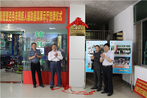 在仪式上,农有明理事长代表百色市残联致欢迎辞,李功强副总经理作了热情洋溢的捐赠感言。李瑞祥副理事长、李功强副总经理分别代表受赠方和捐赠方递交捐赠牌和爱心牌匾。参加活动的领导共同为“百色市残疾人辅助器具展示厅”揭牌。