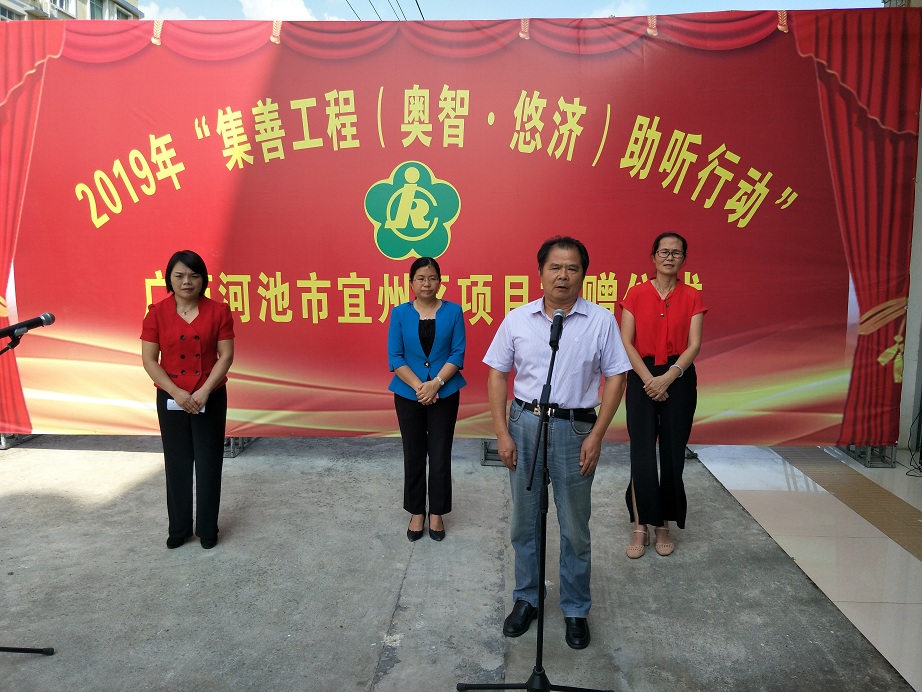2019年9月5日,2019“集善工程——(奥智·悠济)助听行动”广西(河池市宜州区)项目捐赠仪式在宜州区残联举行。广西残疾人福利基金会副理事长韦锦程,河池市残联理事长韦爱銮,河池市宜州区人民政府副区长黄玲丹,宜州区残联理事长唐力欢等领导出席捐赠仪式。