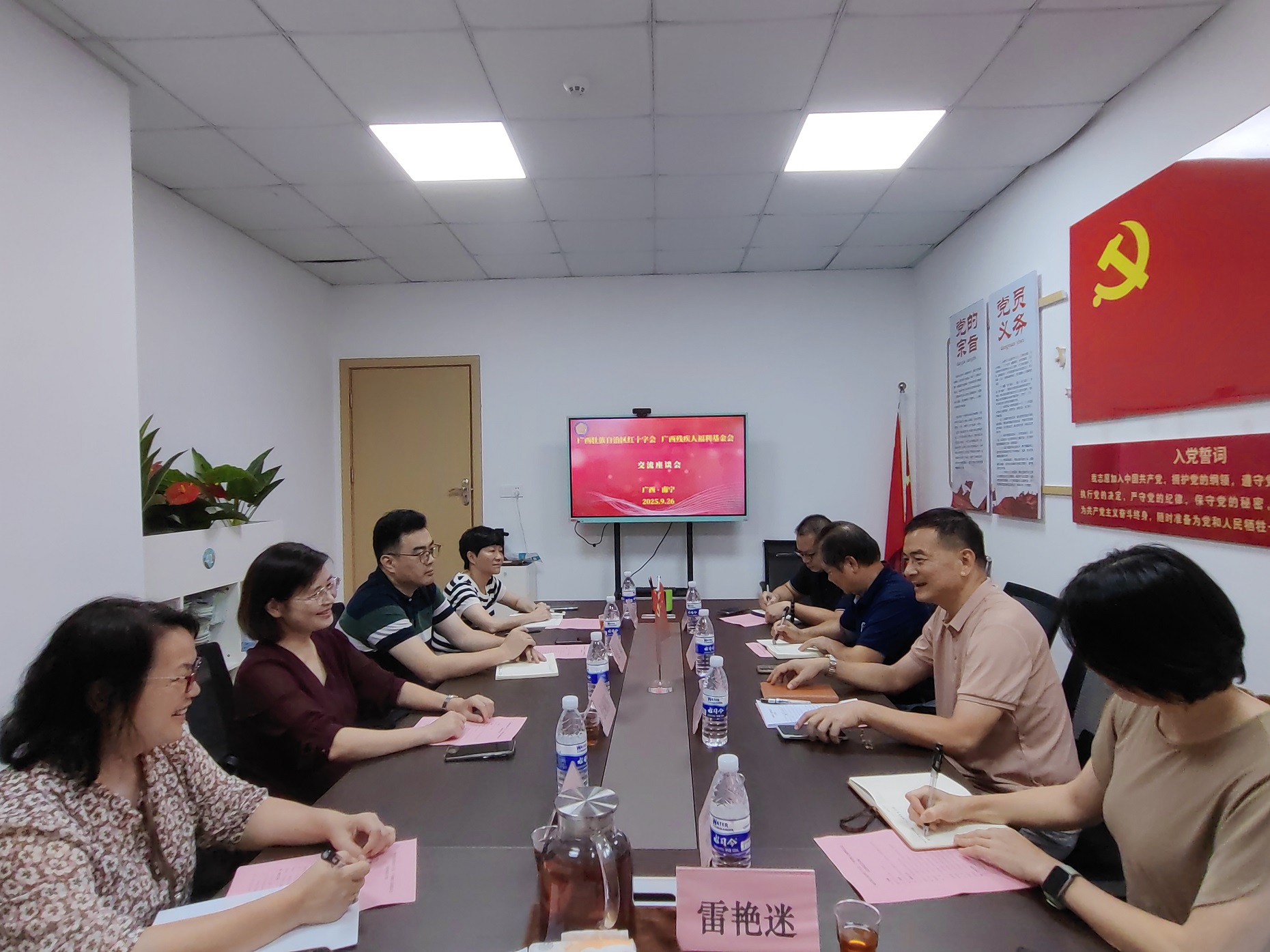 9月26日,广西壮族自治区红十字会党组成员、副会长伍丽东一行4人到广西残疾人福利基金会(以下简称“基金会”)开展交流活动,基金会主要负责人邓莺朕及相关负责人参加座谈会。